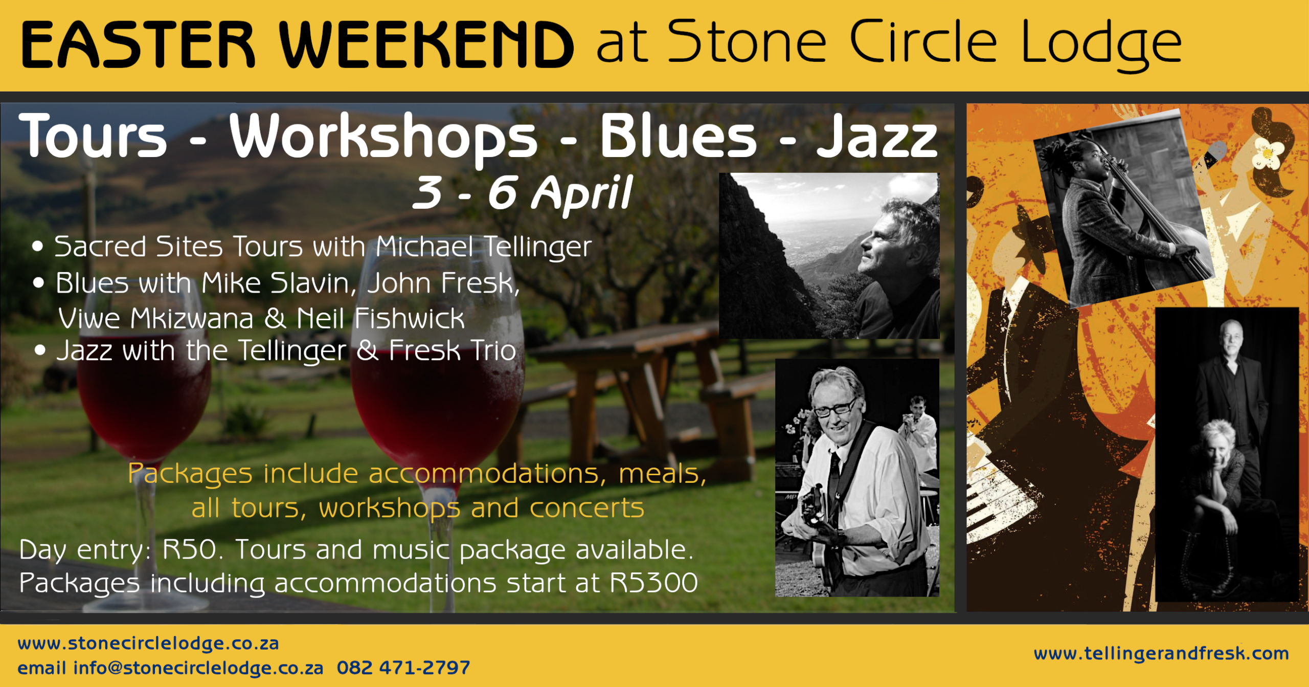 3 nights accommodation, trio of tours and workshops with Michael, all live music, breakfast, dinner, coffee, tea and spring water. R5300